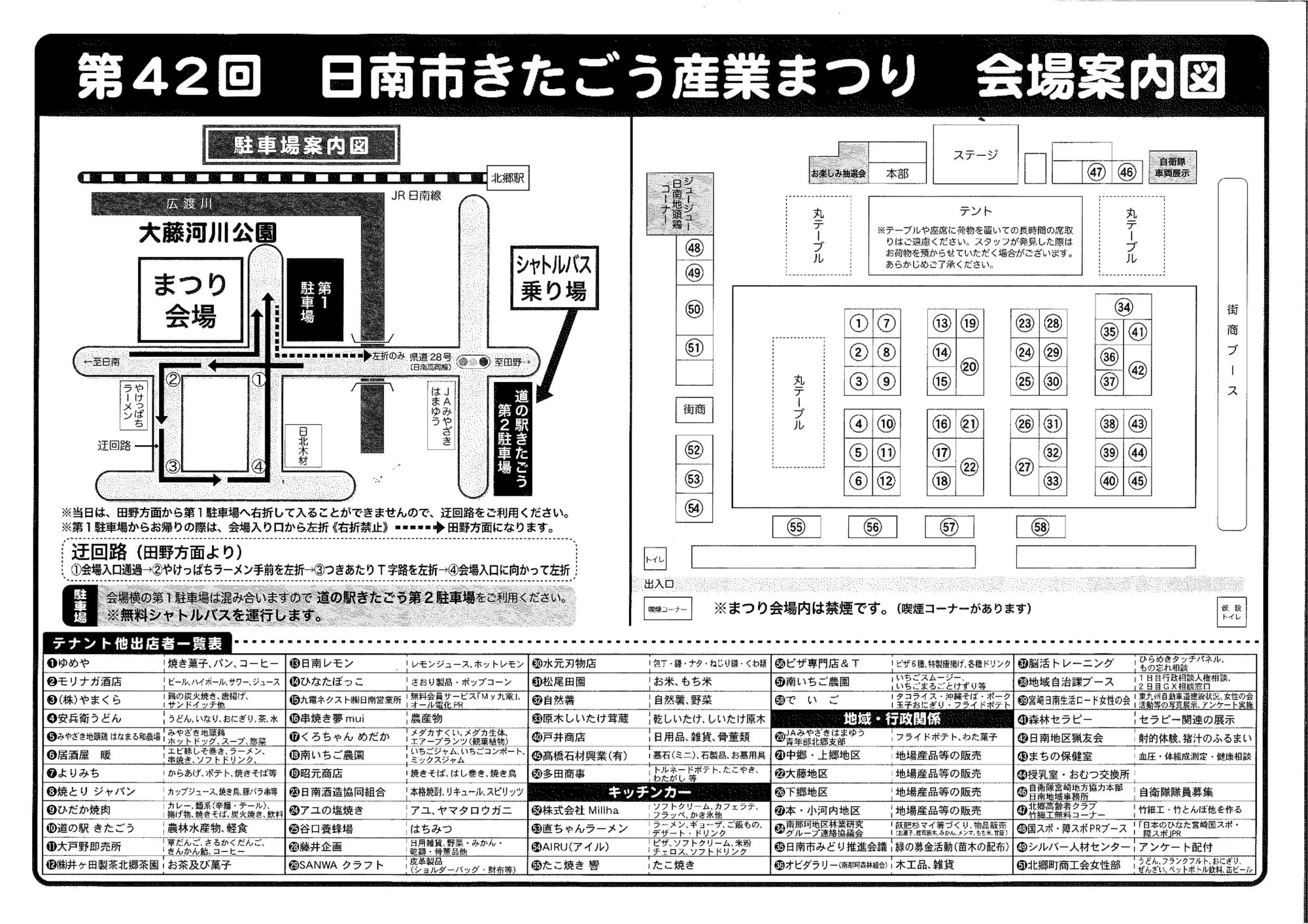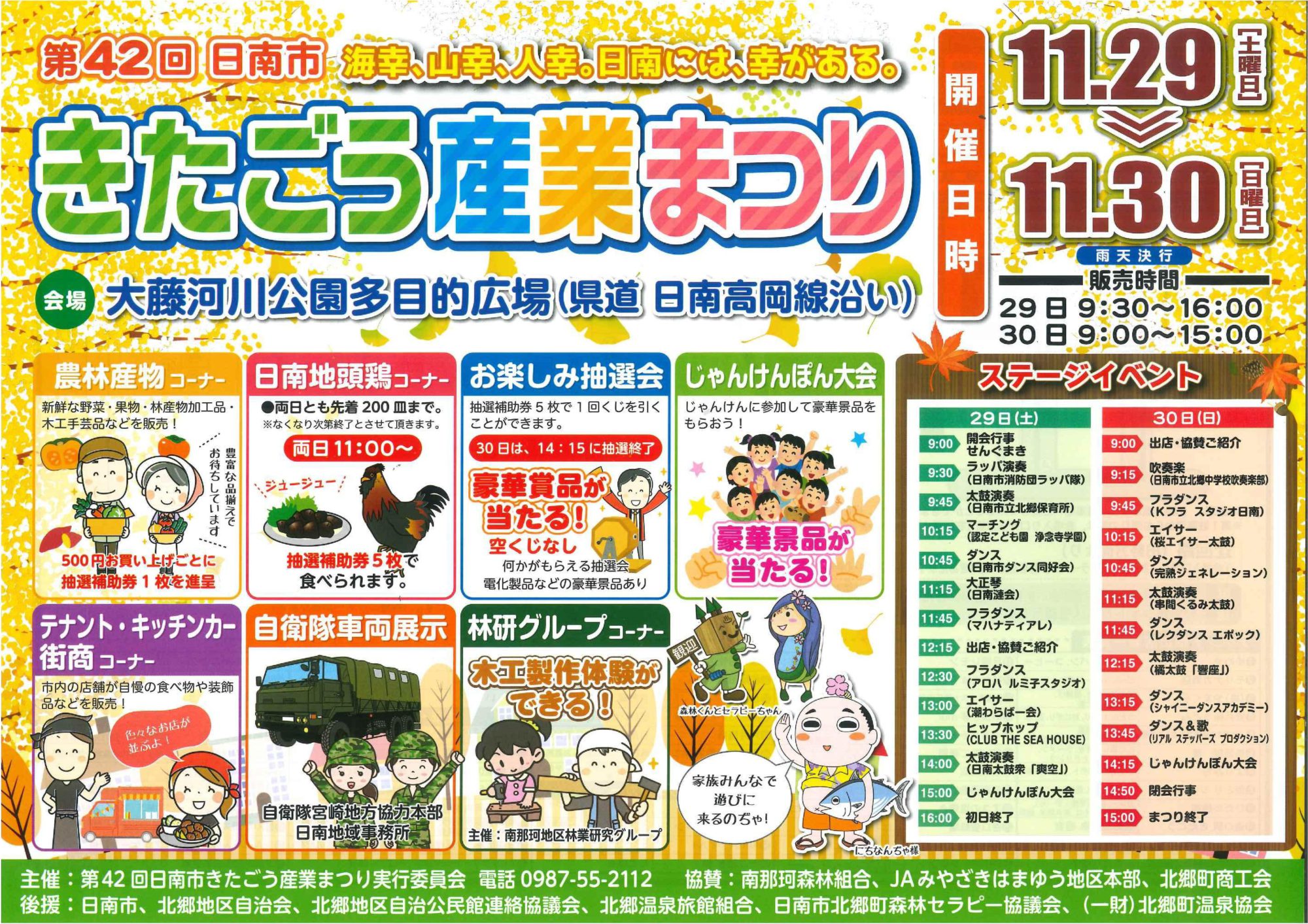 SPOTスポット ホーム イベント 第42回日南市きたごう産業まつり 大藤河川公園多目的広場 (県道 日南高岡線沿い) きたごう産業祭り実行委員会 0987-55-2112 令和7年11月29日(土)・30日(日) あり 【開催日時】 令和7年11月29日(土) 9:30~16:00時 令和7年11月30日(日) 9:00~15:00 【会 場】 大藤河川公園多目的広場 (県道日南高岡線沿い) ■きたごう産業祭りチラシ表 ダウンロード ⇒ こちらから■きたごう産業祭りチラシ裏 ダウンロード ⇒ こちらから 【お問い合わせ】 第42回日南市きたごう産業祭り実行委員会 TEL: 0987-55-2112 エリア: 北郷 周辺の情報 森林セラピー 猪八重渓谷 南いちご農園【いちご摘み体験】 道の駅きたごう サンチェリーきたごう 蜂之巣公園(天然温泉付きコテージ&オートキャンプ) 猪八重温泉足湯 日南寒咲1号 【北郷駅】 焼酎道場